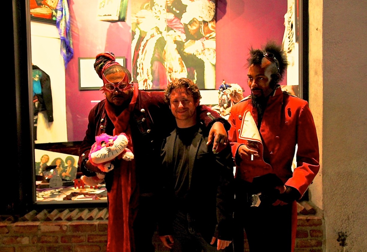 Glass The Tramp, photographer Stevie Ray and Gypsy of Alien SecX Rehab standing outside of Mr Musichead on the Sunset strip.